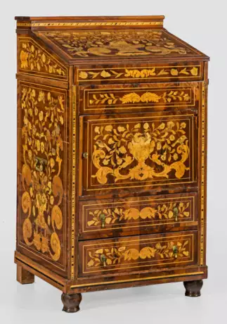 Mahagoni, auf Eichenholz furniert sowie Einlagen aus unterschiedlichen Edelhölzern. Hochrechteckiger Korpus mit seitlichen Griffen. In der Front zwei Schubladen sowie breite Tür. Oberhalb schräggestellte, aufklappbare Arbeitsfläche sowie podestförmiger Abschluss. Innen Spiegel-Auskleidung. Flächendeckender Intarsiendekor aus Blütenzweigen, Vasen, Vögeln, Schmetterlingen und Blattvoluten. Erg.; H. 110 cm. 63 cm x 54 cm.