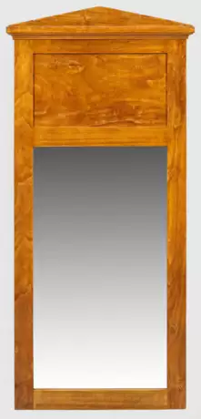 Birkenholz, furniert. Hochrechtekige Spiegelrahmung mit breitem Giebelfeld und flachem Dachabschluss. 136,5 cm x 65 cm.
