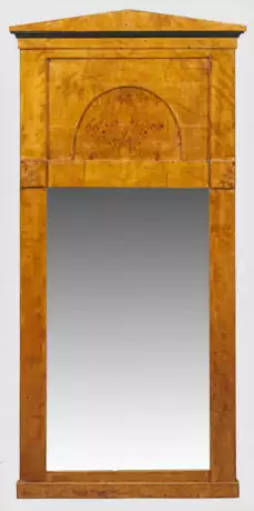 Birkenholz und Birkenmaser, furniert sowie teilw. ebonisiert. Gerade, hochrechteckige Spiegelrahmung. Im breiten Giebelfeld leicht zurückgesetzter Segmentbogen. Flacher Dachabschluss. 132 cm x 65 cm.