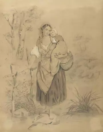 9 kl. Bl. mit Kinderszenen, ╔Gottlieb Emil Kornbeck╗ (1818-1859) zugeschrieben. 4 Bl. aufgezogen. - "Auch eine maskierte Schlittenfahrt". Tls. weiß gehöhte Zeichnung 1855. 8 x 11 cm. Unt. re. monogr. "AF". - Villa in enem Park mit fig. Staffage. Queroval. - Mutter trägt ihr Kind u. einen Korb über Steine in einem Fluss. Tls. zart kolor. Blgr. 28 x 22 cm. An den Ecken punktuell aufgeklebt u. dort verso G.E.Kornbeck zugeschrieben. - Stärker gebr. - Behauene Steine vor bergiger Landschaft. Aquarell. Bleistiftzeichung v. Hermann Rückle, 1887. Blgr. 16,5 x 25 cm. Unt. re. sign. u. dat. Punktuell aufgeklebt.
