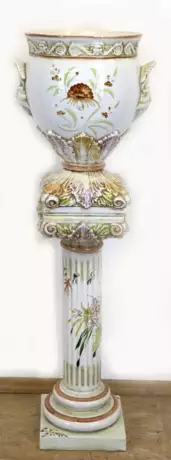 Лот 1019 | Blumensäule mit Übertopf, Keramik, Italien, mit Blumen farbig staffiert, Säule, Deckplatte mit Kleberesten, 63x22x22 cm, Blumentopf auf quadratischem Fuß, mit 2 seitl. Maskaronen, H. 44 cm, Dm. 28 cm