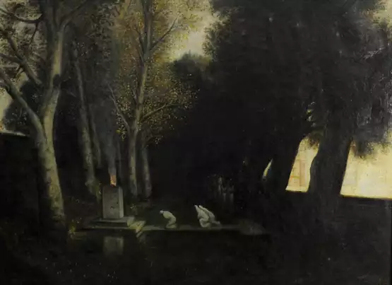 Sammlung Friedrich Ring, Fürth (23.5.1920 - 28.2.2014) (Dessen Vater war im Staatsarchiv München tätig, und wohnte im Schloss Deutenkofen bei Landshut und dessen Vater soll mit Böcklin befreundet gewesen sein.) Sammlung Martin Klaussner, Fürth Sammlung Margot Trantenroth, Großgeschaidt Identische motivische Wiedergabe des Hamburger Bildes Im Format verkleinert im Vergleich zum Original von Arnold Böcklin Rahmung: Originalrahmen aus Holz, vergoldet (Dies könnte Anzeichen dafür sein, dass es eine Kopie von Carlo Böcklin ist, denn anders als die üblichen Stuckrahmen ließ der Vater Arnold Böcklin seine Rahmen aus Holz fertigen.) - Verschmutzt.