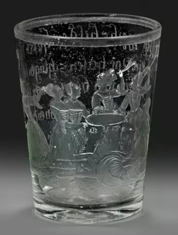 Farbloses Glas mit Mattschnittdekor. Konische Becherform. Schauseitige Darstellung mit sieben Frauen, die sich um eine Männerhose zanken und von denen eine bereits in Ohnmacht gefallen ist. Rückseitig der Text ''Der weibsbilder hosen krieg umb ein par hosen schlagen sich hier sieben weiber jämmerlich, weil keinen man sie könen kriegen müssen die hosen sie vergnügen''. H. 11,8 cm.