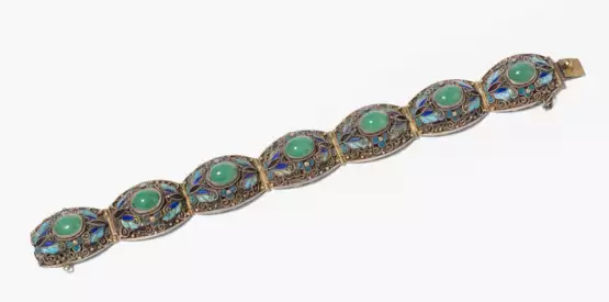 China, 20.Jh. Vergoldetes Silberfiligran mit Jade-Cabochons. Siebengliedriges Armband mit applizierten emaillierten Schmetterlingen. Verschluss mit Silberpunze. L 17,5 cm. Mit Box.