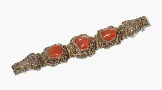 China, 20.Jh. Vergoldetes Silberfiligran mit drei unregelmässig geschliffenen Karneoleinlagen. Fünfgliedrig. Verschluss mit Silberpunze. L 18,5 cm. Mit Box.