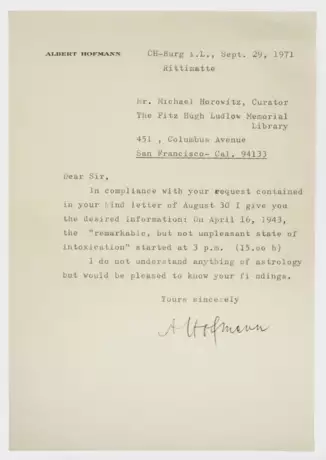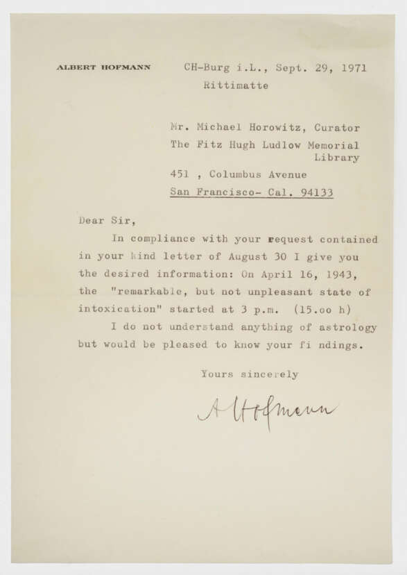 Brief mit Unterschrift, Burg (CH), 29.9.1971 und postalischem Umschlag. Der Schweizer Chemiker, Entdecker und Propagist des LSD Albert Hofmann (1906-2008) liefert in seinem Schreiben an den britischen Schriftsteller und Archivar des "LSD-Papstes" Timothy Leary, Michael Horowitz (geb. 1938) Auskünfte, die dieser angefragt hatte: der Chemiker sendet Horowitz einen Auszug aus dem Protokoll seiner ersten versehentlichen Einnahme des von ihm entdeckten LSD und der damit einher gegangenen Wirkung, die am 16. April 1943 um 15 Uhr einsetzte. 21 cm x 14,6 cm. Minim. Altersspuren.