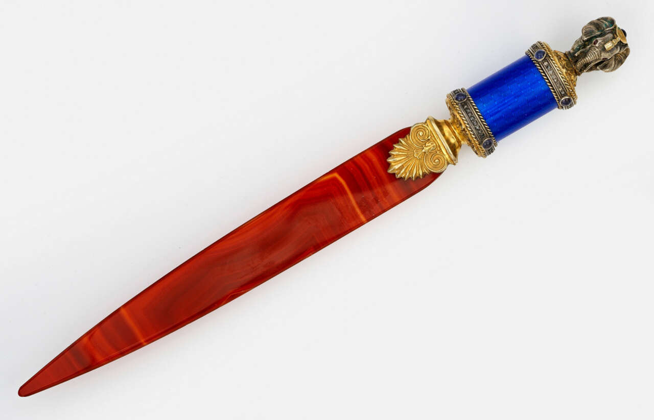 A splendid Russian parcel-gilt and enamelled silver letter opener with an elephant knob in the style of Karl Fabergé. Standard mark 88.
