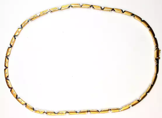 Лот 856 | Brillant-Bogencollier, 585er GG/WG, ausgefasst mit 16 Brillanten von zus. ca. 0,24 ct., VVS-VS, geometrische Gestaltung, mattiertes GG und poliertes WG, Steckschloss mit1 Sicherheitsacht, Ges.-Gew. 27,2 g, L. 43 cm (Wie…