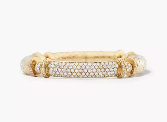Italien. 750 Gelbgold. Aus fünf halbrunden leicht beweglichen Goldgliedern mit Goldkugeln verbunden. Die Glieder teils mit Rautenmuster. Schauseite und Kugeln teils mit Brillantpavés von ca. 2.40 ct. B 9 mm, Innenumfang 17 cm. 46 g.