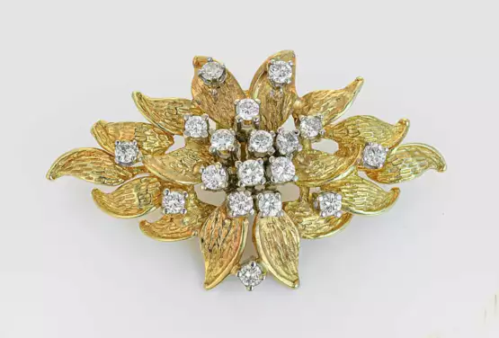Gelbgold, gest. 18 k. Guillochierte, blattförmige Ajour-Arbeit, schauseitig besetzt mit Brillanten von zus. ca. 0,90 ct.; Gew. ca. 9,11 g.