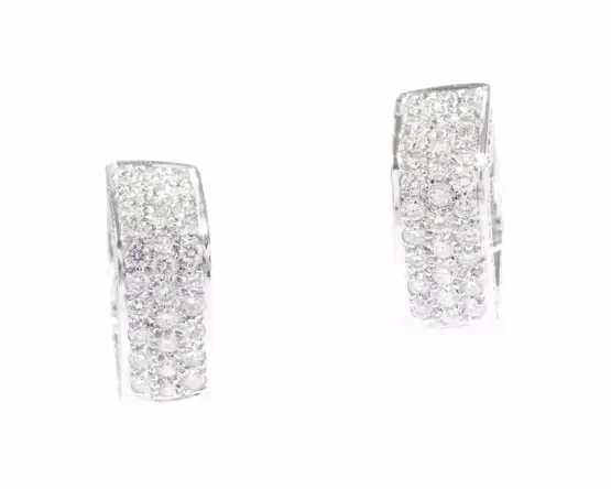 750 Weissgold. Eckig-runde, breite Ohrcreolen mit feinem Brillantpavé von ca. 3 ct G/H-vs/si. L 2 cm, 14 g.