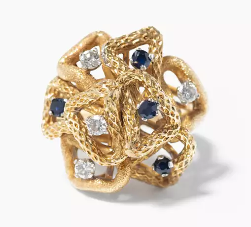 1970er Jahre. 750 Gelbgold. Organisch gestaltet mit strukturierter Oberfläche und Saphir-Brillant-Besatz. Gr. 53, 12 g.