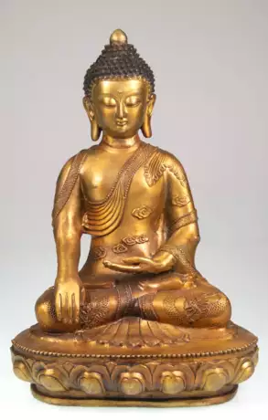 Лот 330 | Bronze-Figur "Buddha in Weihgruß auf einfachem Lotussockel sitzend", doppelt signiert, Ende 1920er Jahre, H.45 cm