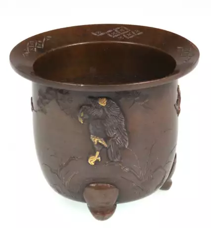 Лот 611 | Bronze-Übertopf, Asien, braun patiniert mit figürlichem und Landschaftsrelief, H. 8 cm, Innen-Dm. 7,5 cm