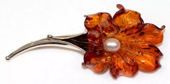 Лот 909 | Brosche mit Bernsteinblüte und echter Perle, 925er Silber, Länge ca. 8 cm, Blüte ca. 3,9 x 3,6 cm