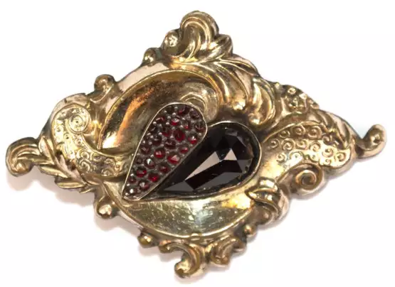 Лот 804 | Brosche, um ca. 1880 /90, Schaumgold, wohl Silber verbödet, 1 Granat im Tropfenschliff und diverse facettierte Granate ca. 5,3 g, Maße ca. 4,4 x 3,1 cm