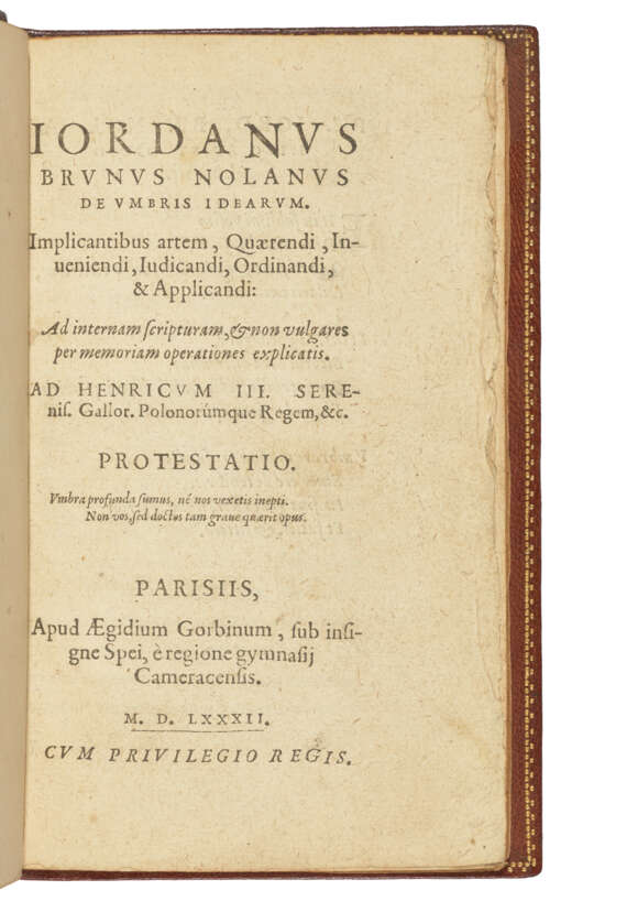 Trained as a Dominican, Bruno fled Italy in 1576 to avoid prosecution for heresy, beginning a life of wanderings through France, England and Germany. De umbris idearum is dedicated to Henri III, whose curiosity had been piqued by the rumours of Bruno's feats of memory. It describes a method for constructing mental ‘memory palaces’ by populating imaginary spaces (loci) with vivid images to aid in memorization. Its exploration of mnemonic techniques and cognition, alongside cosmology and magic, would later influence thinkers including Spinoza and Leibniz.