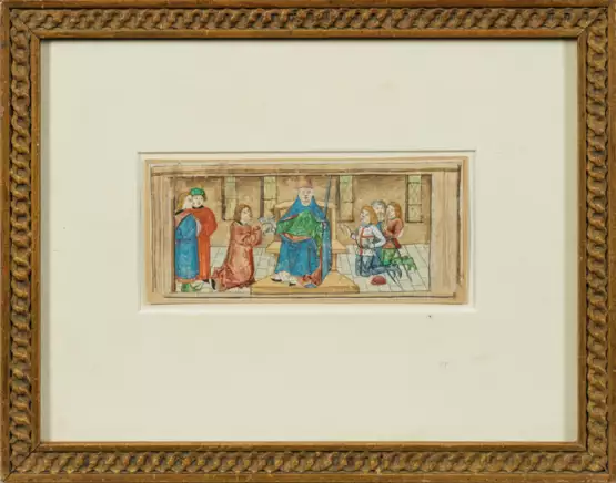 Fein ausgeführte, vielfigurige Szene, in der ein zentral thronender Herrscher seine Untertanen empfängt. Gouache und Deckweiß/Papier, aufgelegt (kaschiert) auf Unterlegpapier. Papier ca. 5,6 cm x 12,9 cm. Rahmen.