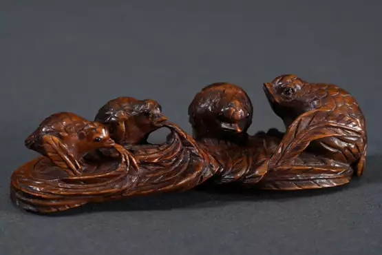 Boxwood netsuke ‘Four quails on millet branches’ w…