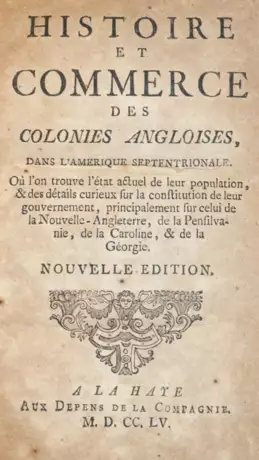 Sabin 9602. Howes B 1049. Kress 5420. Palgrave I, 196. - Zweite Ausgabe, im Jahr der EA ersch. Verf. versucht in Frankreich das Interesse an der ökonomischen Bedeutung der englischen Kolonien in Nordamerika zu wecken u. gleichzeitig auf die Gefährdung der eigenen Kolonien hinzuweisen. - Etw. knittrig, tls. leicht (Titel u. Vorwort stärker) gebräunt, Vors. erneuert. - Exlibris.