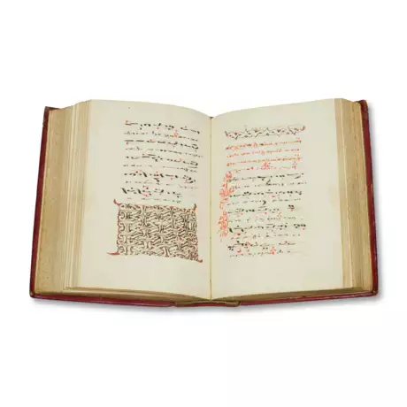 132 x 97mm. i + 334 + i leaves, apparently complete, c.8 lines of text and music, written space: c.95 x 54mm, rubrics, elaborate penwork initials and musical notation in red, decorative headpieces in black and red, coloured 'small wheel' of the eight musical modes on f.10 (some light thumbing and very light damp-staining, else in excellent condition). Bound in 19th-century red morocco elaborately tooled in gold. Brown morocco box gilt. Cloth case.