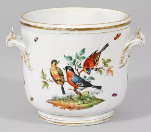 A porcelain cachepot with bird decor. Probably painted outside the manufactory, in the style of a service commissioned by Frederick the Great from Meissen. Minor rubbed. Sceptre mark.
