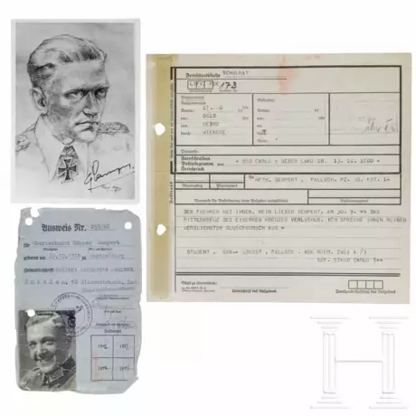 Das Telegramm vom 17.10.44 mit Glückwünschen von Generaloberst Student und dem Eingangsstempel der Fallschirm-Panzer-Jäger-Abteilung 1. Dazu Teile eines Truppenausweises der Fliegerhorstkommandantur Schwerin mit Foto in Heeresuniform sowie eine Nachkriegspostkarte.