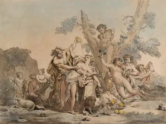 (1734-1796) nach. Bacchanal. Anonyme teilkolor. Umrissradierung auf Karton, 19. Jh. 20 x 26, Blgr. 26,4 x 33 cm. Unter Passep. u. Glas gerahmt.