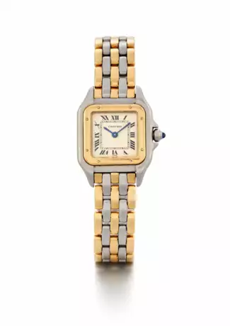 Case/Wristband: Steel, 750/- yellow gold, linked bracelet with double folding clasp, dial white, hands blued, Roman numerals black.