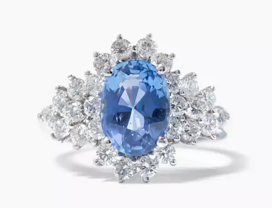 750 Weissgold. Klassischer Brillantring mit schauseitig einem ovalen, wohl unbehandeltem Saphir von ca. 2 ct. und Brillanten von ca. 0.90 ct. Gr. 50, 3 g. Mit mündlichem Bericht GGTL.