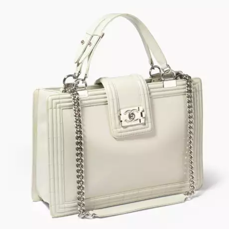 2012. Aus hellgrünem, leicht irisierendem Glattleder. Silberfarbene Metallbeschläge. Zwei Tragegriffe. Langer Kettenriemen aus silberfarbenem Metall mit Lederbesatz. Überschlag mit Steckverschluss. 36x25x10 cm.