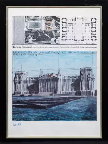 Offset print in colours on light cardboard, 1994. Hand-signed by Christo. Inscribed, dated 1994 and signed in the print. Published by Schumacher Edition Fils, Düsseldorf.