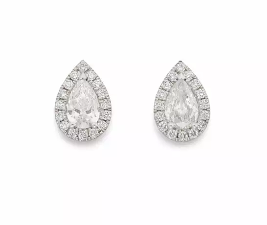 Diamonds: 2 diamonds in pear-cut in total ca. 1,8 ct., G/VS, 32 tiny brilliant-cut diamonds in total ca. 0,3 ct.