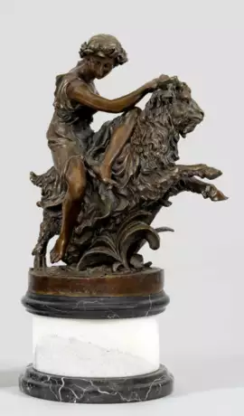 Bronze, dunkelbraun patiniert. Künstler-Bez.; Gießerstempel "Bronze Garantie Paris / J. B. Depose". Nr. A 1143. Schwarz-weißer Marmorsockel. Runde Plinthe. Auf dem Ziegenbock reitende Bacchantin mit Weinpokal. Ges.-H. 51 cm.