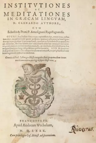 VD16 C 4150. - Erste in Deutschland gedruckte Gemeinschaftsausg. der beiden verbreiteten Lehrwerke, welches auf der Originalausgabe von Löwen (Louvain) 1530 beruht. Mit Beiträgen von Andreas Wechel und Alexander Regius. - Etw. gebräunt, stellenweise etw. fleckig u. wasserrandig. Hs. Eintragung a.T. Ehemaliges Bibliotheksexemplar.