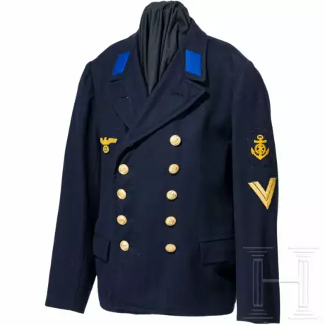 Winterausführung aus marineblauem Wollstoff mit schwarzem Wollfutter und goldenen Ankerknöpfen, vernähter gelbgestickter Brustadler und Laufbahnabzeichen sowie blaue Kragenspiegel.