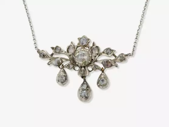 White gold and yellow gold 585/- and silver, assayed. 1 rose-cut diamond of approx. 0.5 ct., CA (N) P2, 16 diamonds in different old cuts totalling approx. 0.6 ct. The central piece was originally a brooch; the necklace was added more recently. Length approx. 43.5 cm. Ca. 9.7 g.