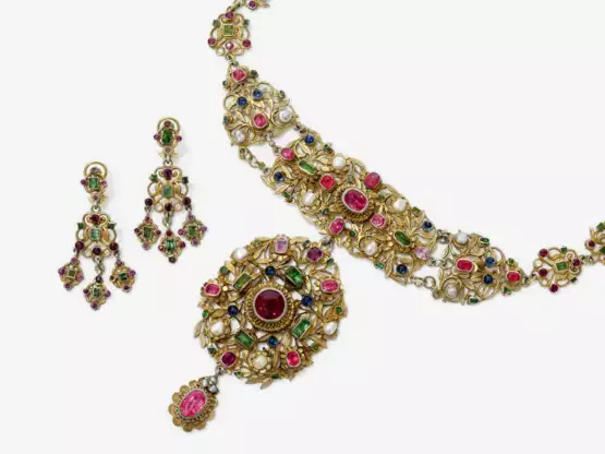 Gilt silver, assayed. Approx. 84 round facet-cut garnets, approx. 79 peridots in different cuts, including trapeze- and oval facet cuts, 12 round sapphire cabochons, 16 pink cushion-cut sapphires. 3 tourmalines: 1 cushion-cut, 1 oval facet-cut and 1 round facet-cut. 16 baroque pearls in various sizes. A few coloured stones are missing, the pieces show minor signs of wear and tear consistent with their age. Necklace: length approx. 38 cm, drop earrings: length approx. 4.7 cm. Totalling ca. 92 g.