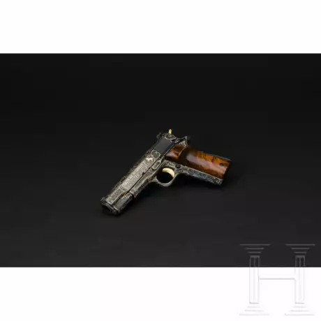 Cal. 9mmLuger, SN. 70L08673, 5" barrel with mirror-like bore. Austrian proof marks, Rohof importer's mark ("ROH" in an oval). 3-line standard markings of this model. Micro-sights with gold-inlaid U-notch. Gilt front sight. Black high-gloss finish, trigger and hammer gold-plated. The grips of burl wood, the left one with a thumb rest. Magazine, the floor plate marked "COLT / CAL. 9MM LUGER". In almost as-new condition, with hardly noticeable signs of use.