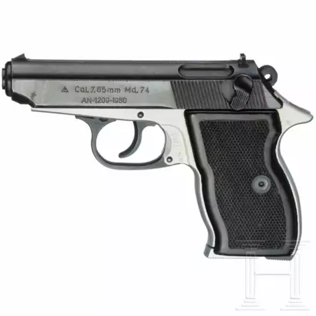 Kal. 7,65mmBrowning, Nr. AN-1209, nummerngleich. Blanker, hartverchromter Lauf. Achtschüssig. Beschuss. Standardbeschriftung. Links am Verschluss Kaliber, Modell und S/N. Fertigung in Fabrica de Armi, Cugir / Rumänien. Vollständige, originale Brünierung an Verschluss und Bedienteilen. Duralgriffstück. Schwarze Kunststoffgriffschalen. Magazin. Geführt bei den bewaffneten Organen der DDR. Fast neue Gesamterhaltung.