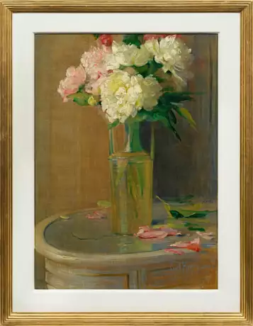 In einer opalisierenden Jugendstilvase sind weiße und zart rosa Pfingstrosen auf der Glasplatte abgestellt. Einige Blütenblätter sind bereits neben die hohe Henkelvase auf die Glasplatte gefallen, auf der auch einige Tropfen des Blumenwassers kunstvolle Lachen bilden. Unterhalb ist eine abgerundete, hell lackierte Kommode zu erkennen, die sich farblich nur wenig vom Hintergrund abhebt. Lichtregie, Tonalität und die präzise Schilderung natürlicher Details sind typisch für den Berliner Künstler in der Zeit um 1900. Der in Pastelltönen gehaltene Farbauftrag ist teilweise pastos, um Stofflichkeit und Tiefenräumlichkeit zu sugerieren. Verso auf der Bildrückseite ist ein nur zart angedeuteter liegender Frauenakt erhalten geblieben. Herrmann gilt als einer der führenden deutschen Vertreter des Neoimpressionismus. Nach einigen Ausbildungsjahren im Atelier von Carl Steffeck in Berlin, studierte er ab 1884 an der Münchner Akademie und arbeitete zunächst als Porträtmaler. 1893 zog es ihn wieder nach Berlin, wo er eine Zeichenschule für Damen eröffnete. 1897 heiratete Herrmann seine 18 Jahre jüngere Malschülerin Sophie Herz, Tochter eines jüdischen Kaufmanns in Nürnberg, der 1852 Schloss Pretzfeld in Oberfranken gekauft hatte. Bei ihrer Hochzeitsreise nach Paris und Brüssel lernten sie 1897 Henry van de Velde kennen, mit dem sie eine lebenslange Freundschaft verband und der ihnen auf Schloss Pretzfeld eine komplette Wohnung quasi als Gesamtkunstwerk einrichtete. 1898 zählte Herrmann zu den Gründungsmitgliedern der Berliner Secession und nach der Teilung der Künstlergruppe 1914, wurde er Präsident der Freien Sezession. Seit 1902 engagierte Herrmann sich zudem im Deutschen Künstlerbund. 1917 wurde ihm der Professorentitel verliehen. Öl/Leinwand; R. u. signiert. 72 cm x 53 cm. Rahmen.