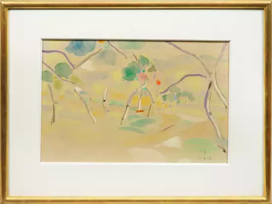 1897 heiratete Herrmann seine 18 Jahre jüngere Malschülerin Sophie Herz, Tochter eines jüdischen Kaufmanns in Nürnberg, der 1852 Schloss Pretzfeld in Oberfranken gekauft hatte. Dort ließ sich das Paar von dem Architekten und Designer Henry van de Velde eine komplette Wohnung quasi als Gesamtkunstwerk einrichten. 1918 wurde Herrmann zum Professor der Berliner Akademie ernannt, während seines Aufenthaltes auf Schloss Pretzfeld im Frühjahr desselben Jahres, entstanden mehrere aquarellierte Pastellkreidezeichnungen mit Weißhöhungen in expressiv-reduziertem Duktus. Die schattenlosen, seltsam gebogenen Obstbäume, die eher über die Wiese wandern als dass sie aus ihr herauswachsen, erinnern entfernt an japanische Holzschnitte. Herrmann gilt als einer der führenden deutschen Vertreter des Neoimpressionismus, der sich bis ins hohe Alter künstlerisch immer weiterentwickelte. Aquarell und Deckweiß/Papier. R. u. monogrammiert und tagesdatiert 24.4(19)18. Passepartoutausschnitt 30 cm x 46 cm. Rahmen.