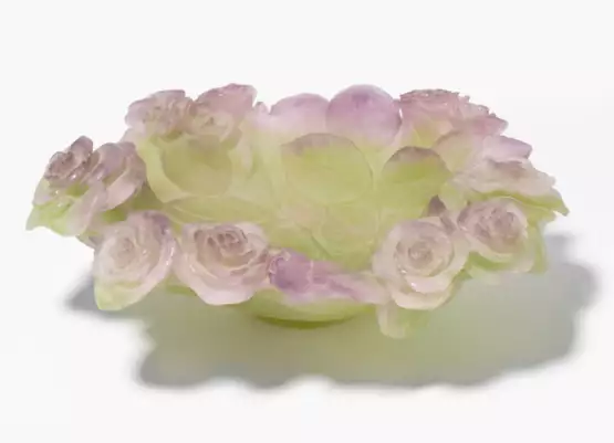 Nancy, Ende 20.Jh. Pâte de Verre, Grün, Rosa. Vollplastischer Rosendekor. Unbezeichnet. D 27 cm.