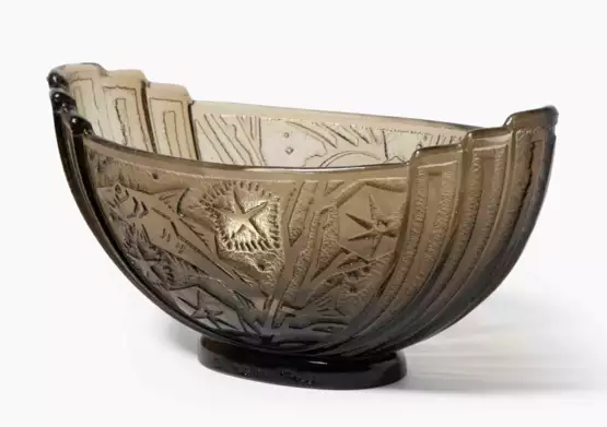 Nancy, um 1930. Rauchglas, moulé-pressé. Meeresdekor mit Fischen und Seesternen. Am Fuss signiert "DAUM, Lothringerkreuz, NANCY FRANCE" (formgepresst). L 29,5 cm.