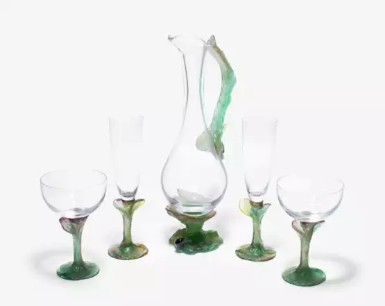 Ende 20.Jh. Falbloses Glas und grünes Pâte de Verre. Stilisierter floraler Dekor im Relief. Bestand: 1 Krug (H 37 cm), 8 Champagnerschalen (H 16 cm), 10 Champagnergläser (H 24 cm). Total 19 Teile.