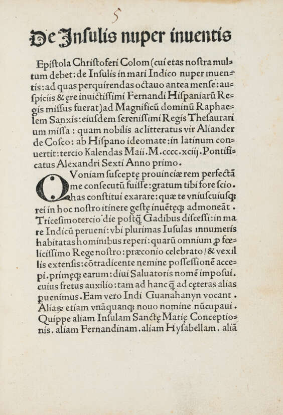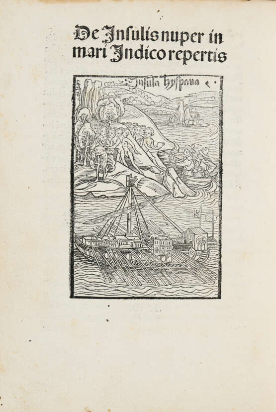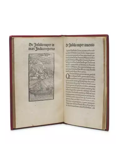 The first Latin edition of the letter was printed at Rome later in 1493. Latin was the language in which it spread across Europe. When it crossed the Alps and reached Basel, the Basel printer became the first to include illustrations of the New World. The first Basel edition of 1493 survives in 5 copies only, all in institutions. The second Basel edition – the present work – is well represented in institutions but only three copies (one imperfect) besides this one have been offered at auction in over 60 years. The Basel editions are the only 15th-century editions of the Latin text to have been illustrated. As the letter was an announcement of breaking news, and Columbus and his successors continued to go back and forth across the Atlantic, it quickly became out of date and there are very few editions made after 1494.