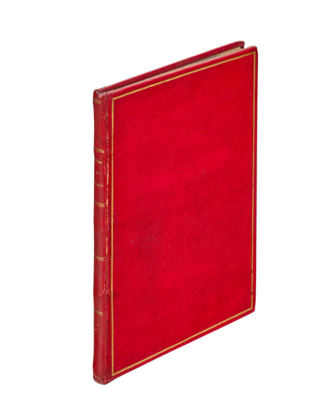 Quarto (207 x 145mm). 36 leaves. Six woodcuts, comprising five large views and one coat-of-arms, Lombard initials, a few initial spaces (narrow stain to top paper edge of first and last several leaves including title, a very tiny worm-hole in outside margin.) 19th-century red morocco-grained sheep, covers gilt ruled, spine gilt (minor repair to joints). Provenance: about four pages in the first section with contemporary marginalia and a little underscoring in neat red ink – Henry A. Huth, 1815-1878 (morocco bookplate, his catalogue, 1880, p.1521; his sale, Sotheby, Wilkinson & Hodge, part 8, July 1919, lot 7707) – J.C. McCoy, 1862-1934 (morocco bookplate) – Juan Gyselynck (engraved pictorial bookplate) – Florencio Gavito, viscount of Alborada and Villarubio, 1882-1960 (armorial bookplate).