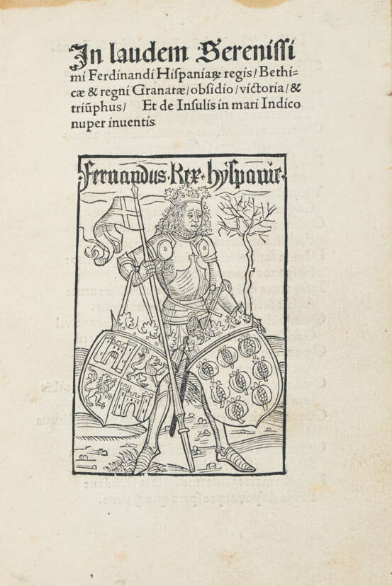 The Columbus letter is preceded by a drama in prose and verse celebrating the military campaign under Ferdinand and Isabella to capture Grenada, ending eight centuries of Muslim rule in Spain and Portugal. Written by Verardus and performed at Rome in 1492, editions were printed at Rome in 1492 and 1493. The conjunction of the two texts here serves to emphasize the power of Ferdinand and Isabella and celebrate their annus mirabilis of 1492 and is new to this edition, not present in the first Basel edition. Campbell, Earliest Printed Maps 70, pp.100-102; Church 8; Alden-Landis, 494/9; Sabin, 98923; Goff V-125; Davis, Fairfax-Murray, German, 424; Medina 15; JCB I, 25; ISTC iv00125000.