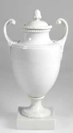 Лот 391 | Deckelvase im Empirestil, Fürstenberg, weiß, auf quadratischem Fuß, mit 2 seitl. Handhaben, Pinienzapfen als Deckelbekrönung, H. 34 cm