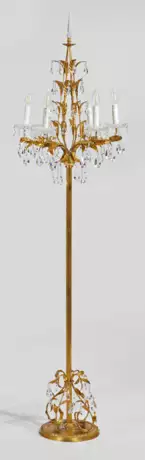 6-flg.; Metall, vergoldet und farbloses Kristallglas. Über flacher Basis schlanker Rundschaft, flankiert von Volutenmotiven. Oberhalb geschweifte Leuchterarme aus Blattwerk. Reicher Behang aus facettierten Prismen. Elektrifiziert. H. 193 cm.